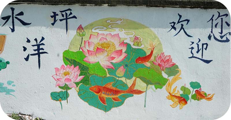 创作之路从不是坦途,雨水成了第一个“拦路虎”。它常常不期而至,打乱画笔的节奏。但队员们总能迅速用防尘膜为未完成的画作“遮风挡雨”,雨一停便即刻重返“战场”。为不影响进度,并避开午间高温,实践团调整作息。清晨的第一缕阳光见证着他们的忙碌,深夜的照明灯陪伴着他们的专注。“这些娃娃太能吃苦了!早上赶在太阳之前来,晚上还借着灯接着画,真是把咱村的事当自家事办。”60多岁的村民向国林每天都来这边转两圈,看着斑驳墙面一点点被鲜活的色彩覆盖,忍不住跟邻里感慨。经过六天五夜的接力奋战,一幅幅充满创意与生机的墙绘终于在水洋坪村绽放。路过的村民纷纷驻足,望着墙上的悠悠紫藤,芊芊荷花,嬉戏玩闹的小猫,笑着竖起大拇指:“这下村里可真不一样了!”