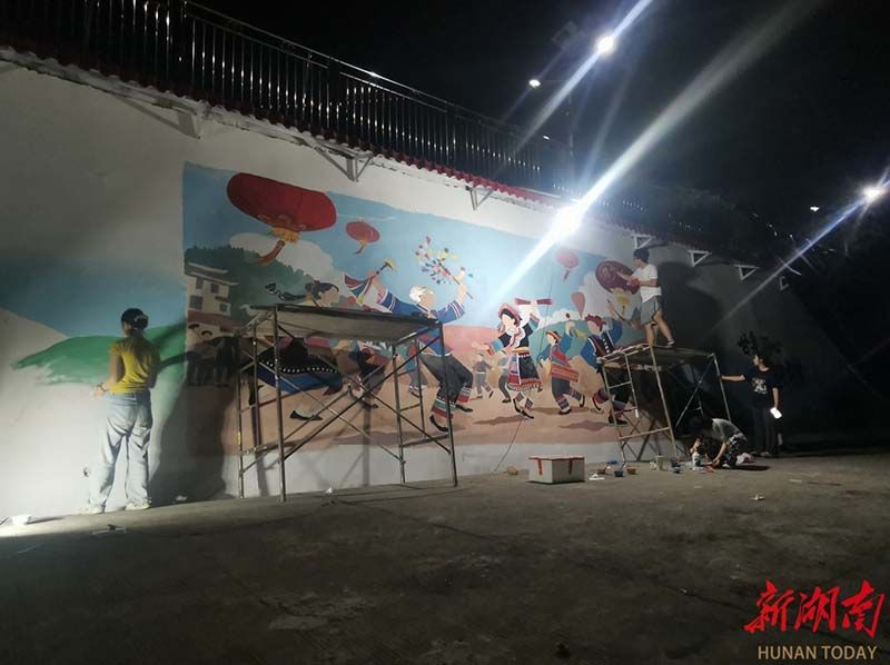 长达六日的创作是一场与天气的较量,11人的团队面临着暴雨毁稿、高温暴晒、人手紧缺等挑战。白天协调物资搭雨棚,深夜挑灯修改画稿;实践团无畏困难用青春笔触勾勒瑶乡根脉的精神带动了村民自发加入——何大姐端来解暑凉茶,瑶族孩子和青年共同拿起了画笔绘制自己的家园。从"穷山窝"到“聚宝盆”,从"搬得出”到“稳得住”,这面会说话的文化墙,正见证着瑶族同胞在党和政府关怀下,用双手绘就幸福生活的奋斗轨迹。