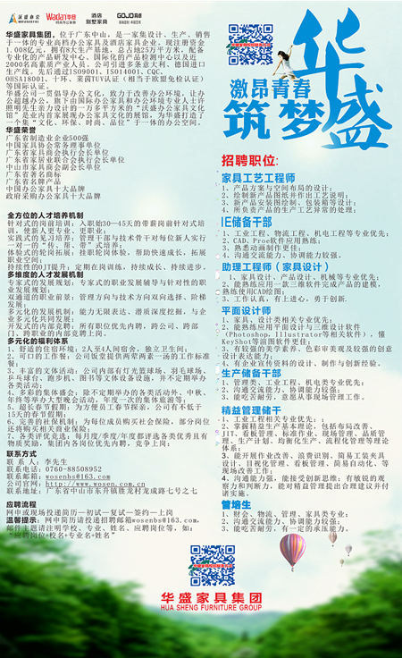 华盛家具制造有限公司(华盛家具集团),位于广东中山,集设计、生产、销售于一体的专业高端办公家具及酒店家具企业。现有8大生产基地,总占地25万平方米。先后通过ISO9001、ISO14001、CQC、OHSA18001、十环、莱茵TUV认证(相当于欧盟免检认证)等国际认证。