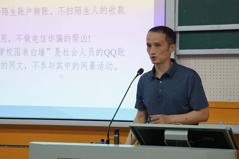接着,刘苇老师结合自身经历,语重心长地引导学生重视生涯规划,鼓励学生行动起来,切莫浪费光阴。同时他提醒同学们要加强对人身财产安全的关注,对同学们进行了宿舍用电安全、暑期求职安全、严防电信诈骗等方面的安全教育,并严肃强调学风建设的重要性,对考勤、考风、日常纪律提出严格要求。