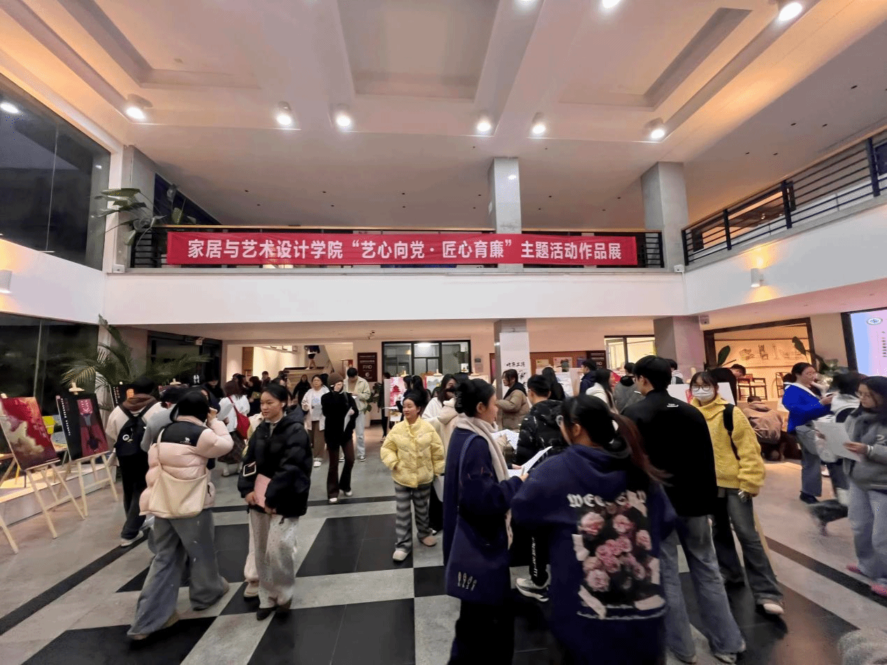 展览作品以艺韵颂廉为创作核心,师生围绕廉洁自律、家风建设、反对“四风”、弘扬正气等内容开展艺术创作。作品巧妙融入专业特色,如将榫卯结构的严谨精密寓意为规矩意识,以玉竹、荷花等传统意象传递清正高洁的品格,在设计语言中凝结廉洁理念,实现思想性与艺术性的高度统一。展览以匠心楼大厅为主要展区,同时延伸至创作空间、廉洁教育基地,形成线上线下联动的立体展示格局。师生在欣赏作品的同时,潜移默化地接受廉洁教育,于艺术审美中深化对廉洁初心的理解与认同。
