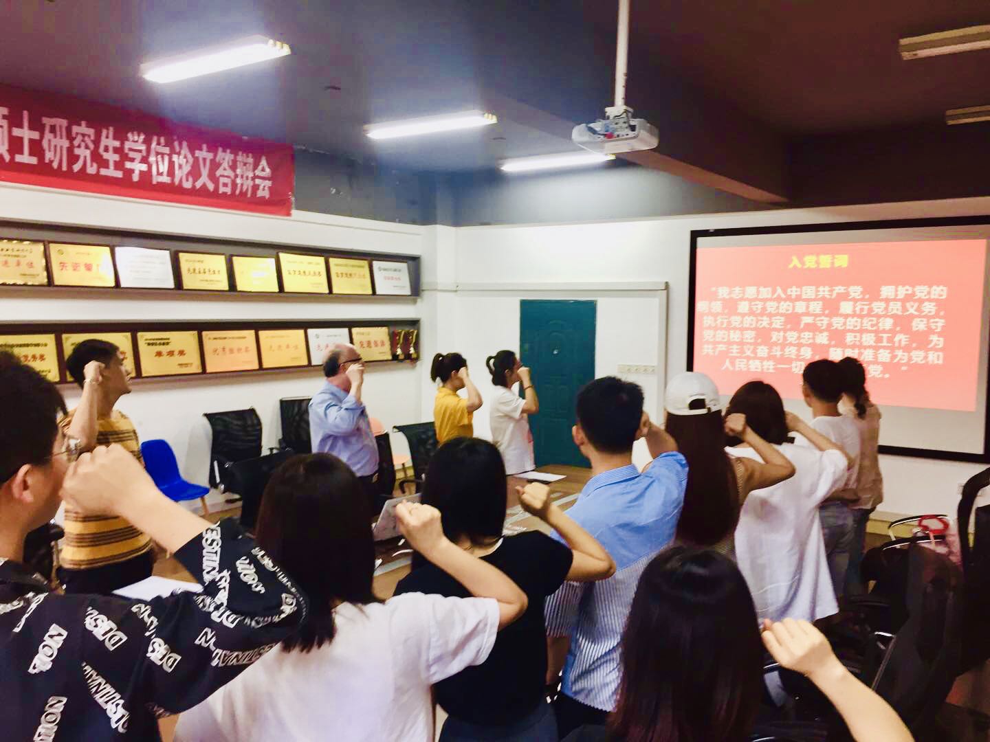 大会在雄壮的国歌声中拉开序幕。在研究生第一党支部副书记赵芳甜的领誓下,与会党员佩戴党员徽章,庄严地举起右手,共同重温入党誓词,表达了为共产主义事业奋斗终身的理想和信念。