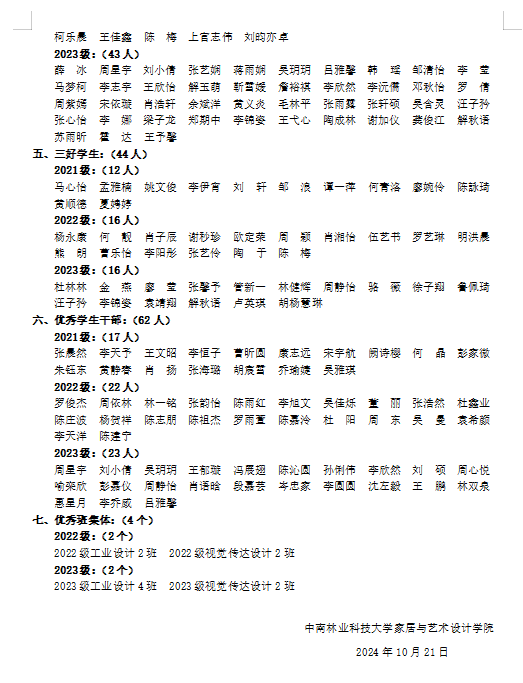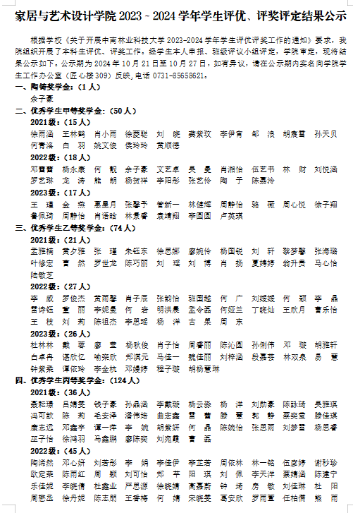 根据学校《关于开展中南林业科技大学2023-2024学年学生评优评奖工作的通知》要求,我院组织开展了本科生评优、评奖工作。经学生本人申报、班级评议小组评定,学院审定,现将结果公示如下。公示期为2024年10月21日至10月27日,如有异议,请在公示期内实名向学院学生工作办公室(匠心楼309)反映,电话0731-85658621。