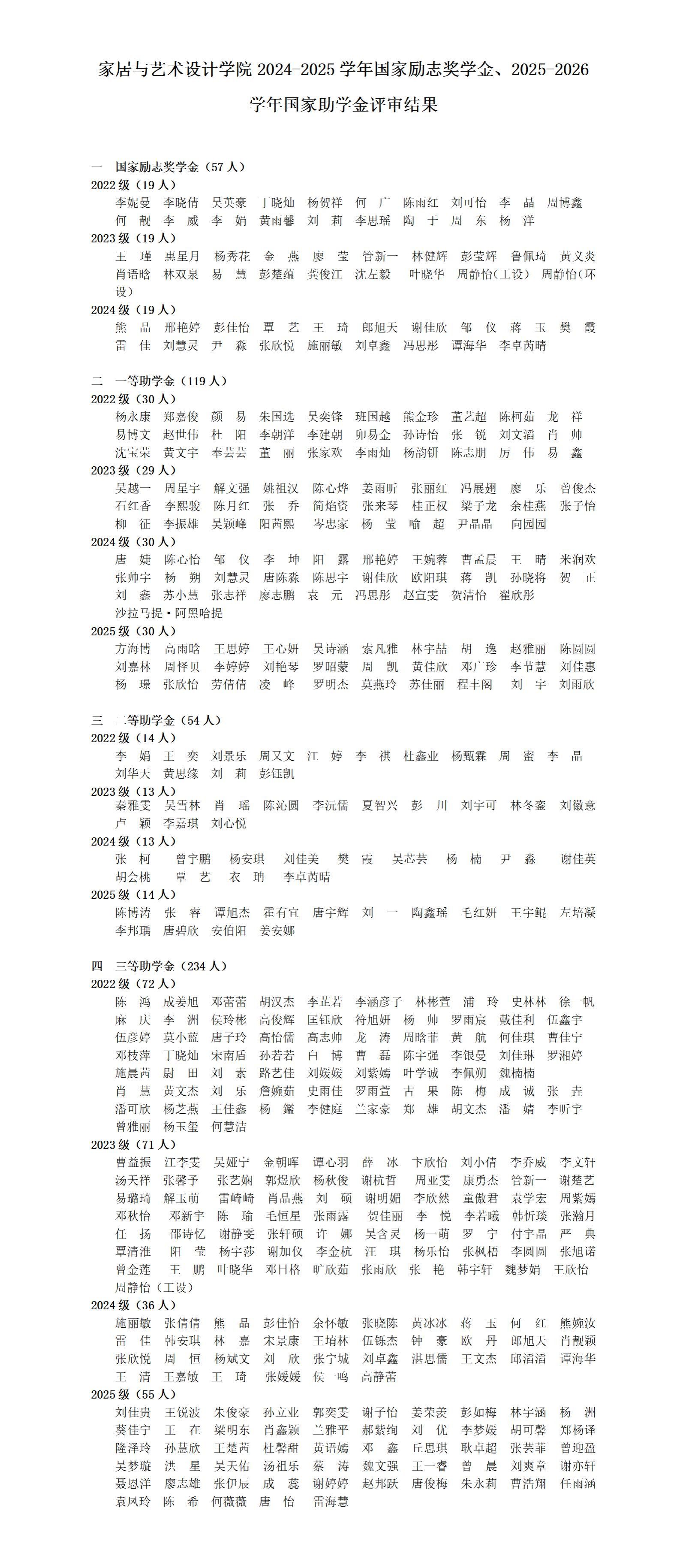 根据《中南林业科技大学学生资助工作管理办法》、《中南林业科技大学家居与艺术设计学院国家励志奖学金及国家助学金评选细则》文件的要求,我院组织开展了国家励志奖学金、国家助学金的评选工作。经学生本人申报、班级评议小组审核,学院审定,现将结果公示如下。公示期为2025年10月22日至10月28日,如有异议,请在公示期内实名向学院学生工作办公室(匠心楼309)反映,电话0731-85658621。