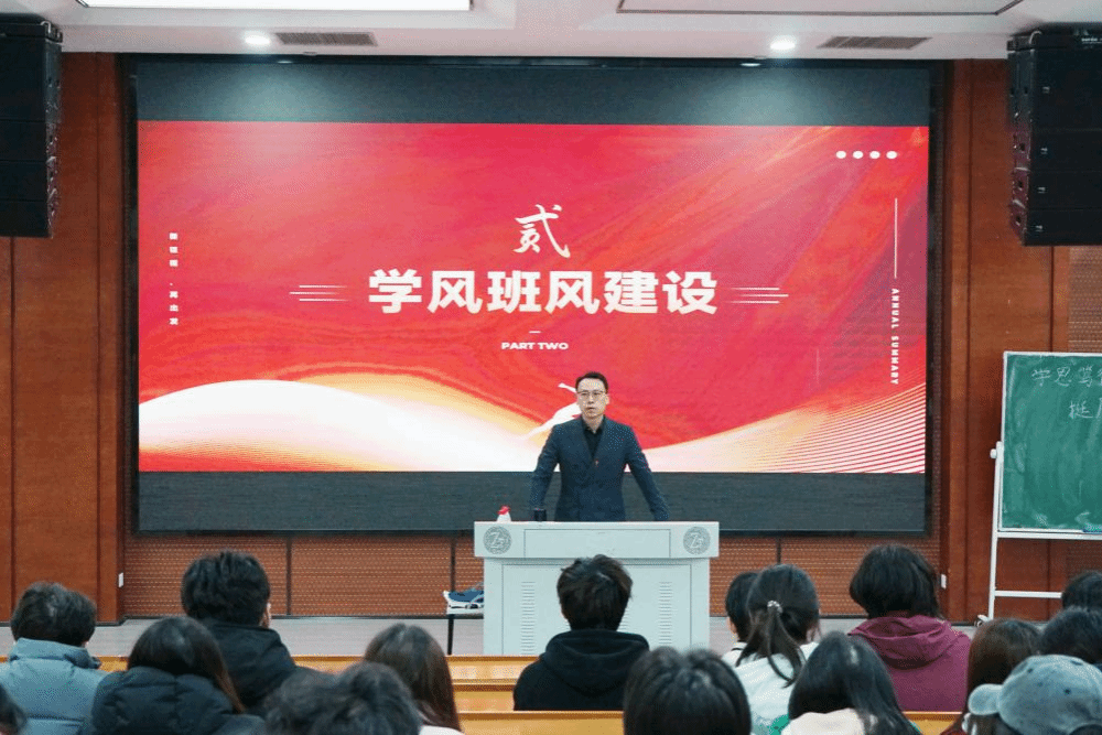 紧接着,张广酃副书记围绕“学风班风建设”发言。他引导学生坚守诚信底线与纪律红线,坚决抵制舞弊行为,共同营造良好学风。同时,结合学院成长档案,尽早规划个人发展,立足专业与社会需求提升竞争力,阐述了五条发展路径,鼓励学生明确目标、踏实行动。