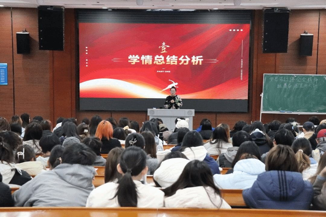 大会伊始,姚飞洋老师作学情总结分析,通报了各专业必修课程通过率、学业预警、所获成果、各类证书考取情况等情况,指出学业表现仍有提升空间,强调英语能力与职业技能的重要性,结合自身经历鼓励学生参与竞赛、志愿服务等活动,提升综合素养。