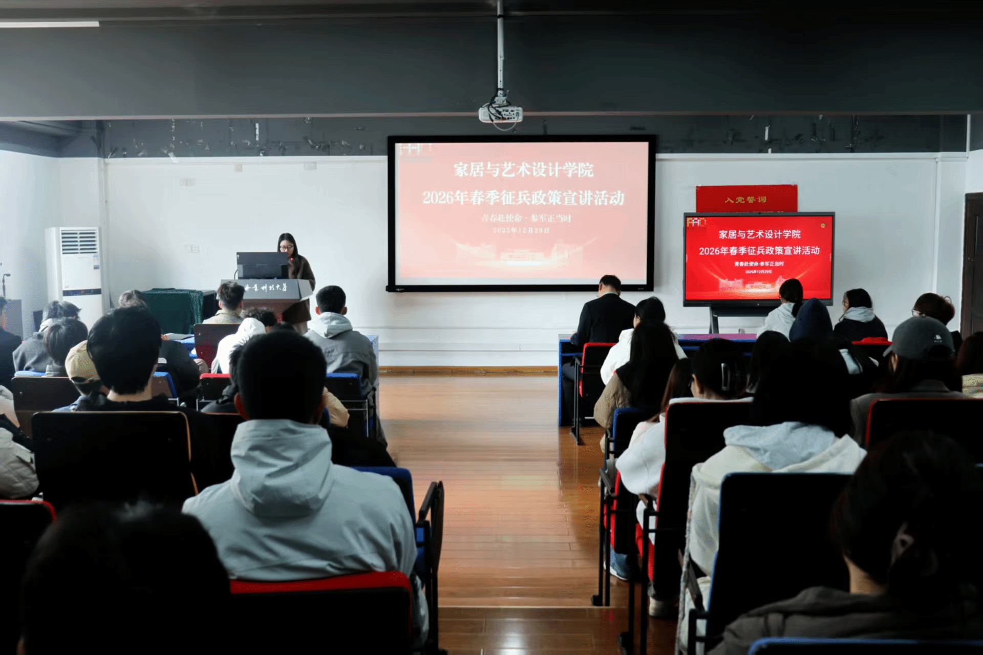 (文/学工办)12月29日,我院在匠心楼325报告厅举行 2026 年春季征兵政策宣讲会。学院党委副书记张广酃、两位优秀退役同学于其晖、常永祥出席本次宣讲会,众多有志于投身国防事业的同学到场聆听。宣讲会由学院武装专干朱虹旭老师主持。