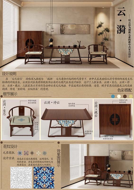 在“文化自信”战略深入推进与“国潮”文化蓬勃兴起的时代背景下,新中式家具面临从符号堆砌向深度文化转译的升级需求。云漪系列家具将传统服饰云肩的与现代家具设计融合,设计了三款家具:云漪·坐忘、云漪·停云、云漪·藏云,三款家具以不同形态诠释云肩文化内涵,运用云肩的轮廓、造型,赋予家具沉稳基底上的流动韵律,传递“坐卧间,云纹轻漾”的意境。